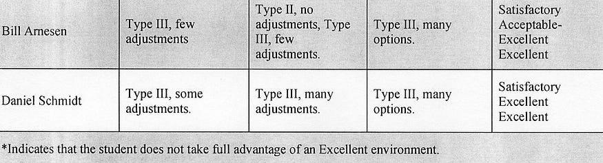 Daniel Schmidt and Bill Arnesen attended Type III schools with some moderate adjustments for them. This made the environment Satisfactory, but not Excellent.
