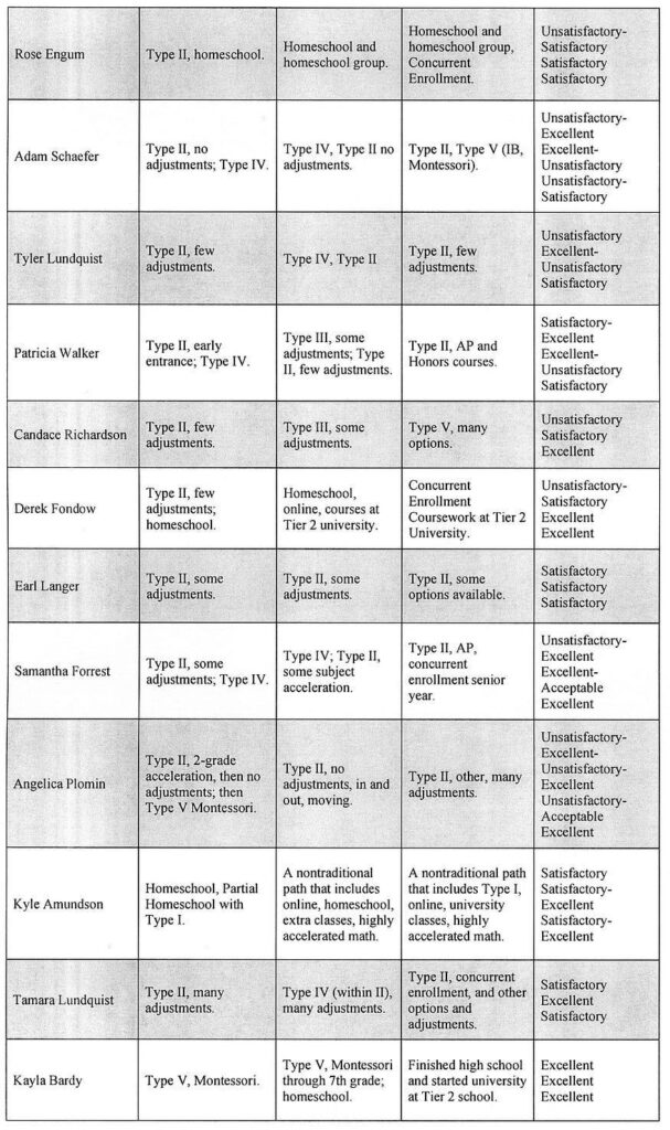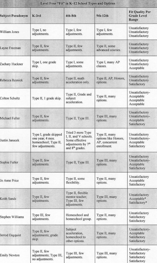 Earl Langer’s experience was Satisfactory because he was in a Type II school that had a modest gifted program throughout his grade school years. Both Adam Schaefer and Samantha Forrest started in a Type II school that was Unsatisfactory for them, and they, too, were enrolled in the same Type IV school for their third- through fifth-grade years and found it an Excellent fit.